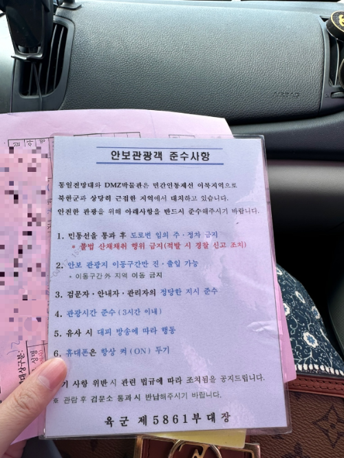 안보관광객 준수사항과, 인적사항이 적힌 핑크색종이, 그리고 노란색 출입판도 주신다.