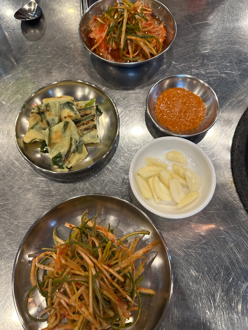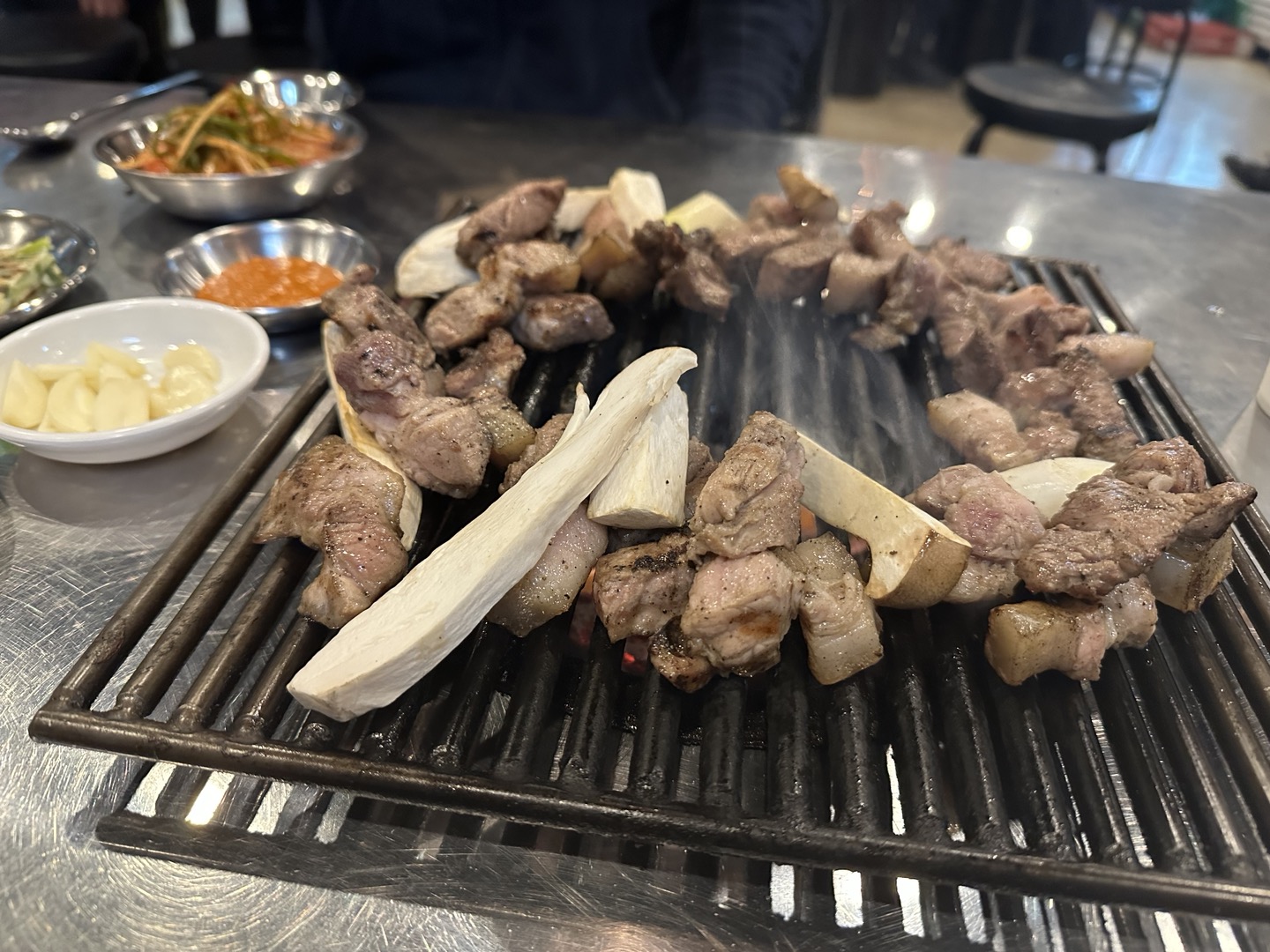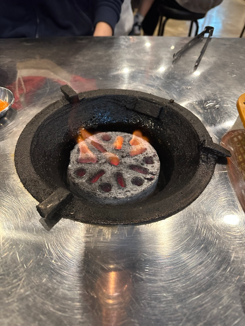 기본 반찬과 연탄불을 세팅해 주셨습니다! 사이드로 된장찌개도 나옵니다.
