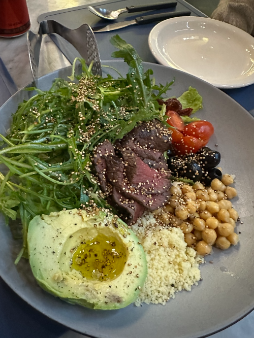저희가 주문한 음식은 아보카도 비프스테이크 샐러드와 로제스파게티 그리고 고르곤졸라 피자입니다.
