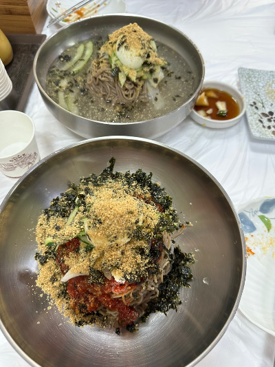 나는 메밀 비빔 막국수, 동생은 메밀 물 막국수, 신랑은 들깨 메밀 칼국수를~~