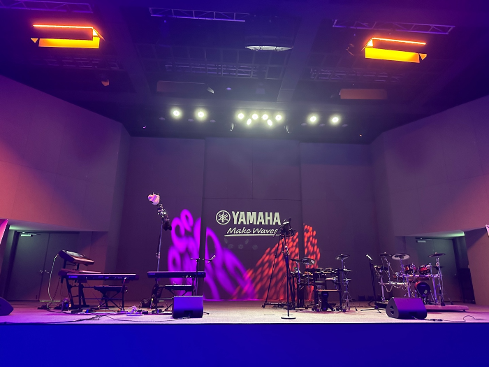 야마하 여러 종류의 신시사이저와 전자드럼이 세팅되어 있다.