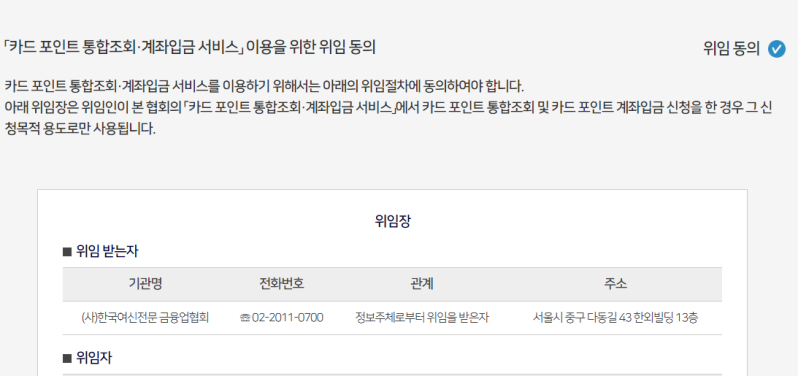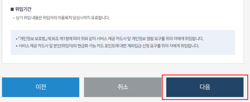 오른쪽 상단의 위임 동의를 클릭하고, 빨간색으로 표시된 네모박스를 눌러줍니다.
