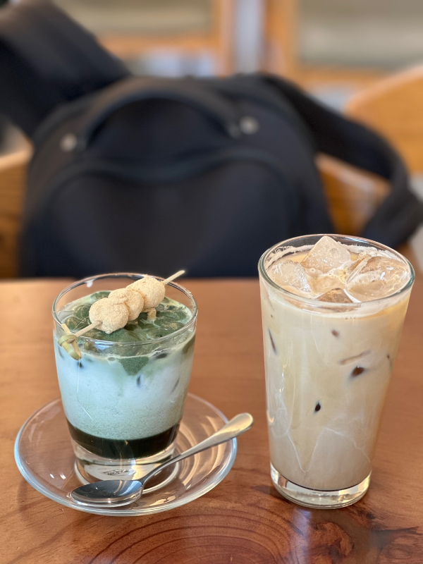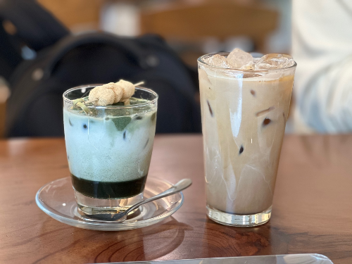 우리는 포레스트라떼와 바닐라라떼, 그리고 소금빵 시나몬애플파이를 주문했다.